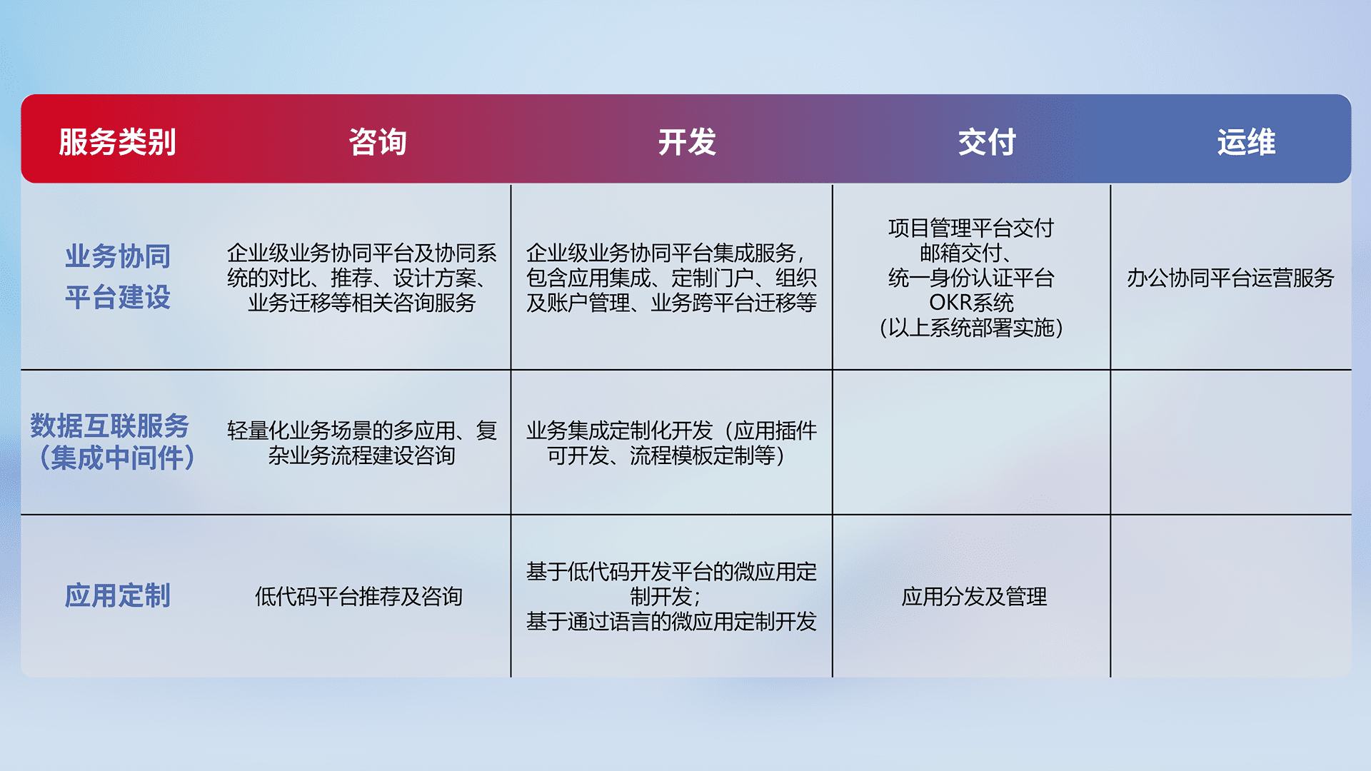 针对钉钉、、、企微、、IDaas等平台级产品提供产品的规划、、方案、、、交付、、定制化开发等服务,,,,实现如统一协同办公、、智能客户服务、、混合会议管理、、、、智能数据查询、、、、等业务场景,,,实现数字化转型。。。。